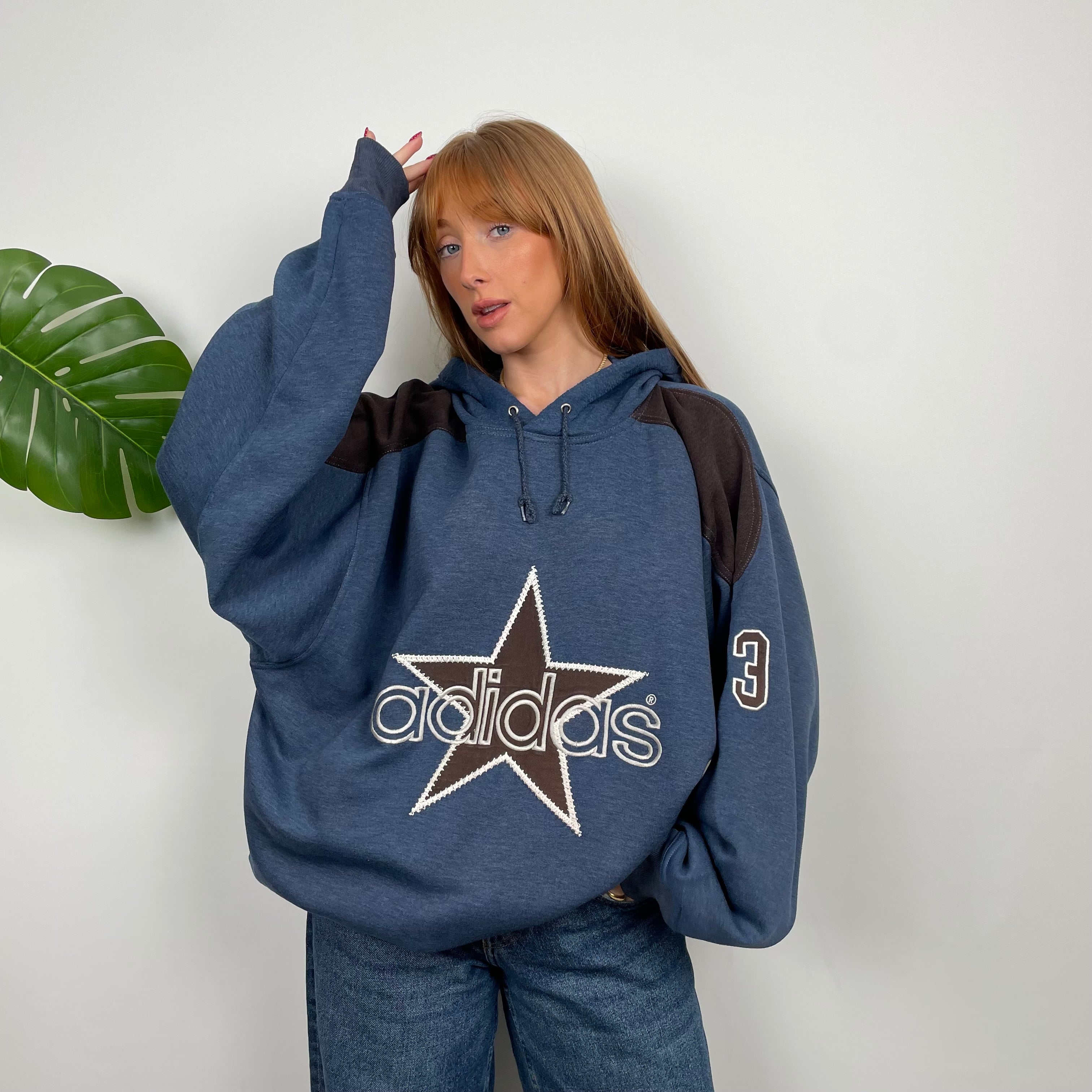 • Stunning blue vintage Adidas hoodie featuring embroidered spell out and logo with brown panelling on the sleeves, a very rare find from the Adidas collection 💙🤩✨☁️